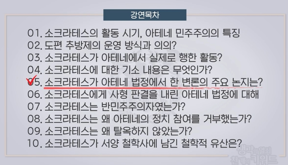 [Q5. 소크라테스가 아테네 법정에서 한 변론의 주요 논지는?] 소크라테스에 대한 기소는 불경죄와 젊은이 타락 죄이지만, 소크라테스는 그러한 기소 내용은 사실 형식적인 것이고, 이러한 형식적